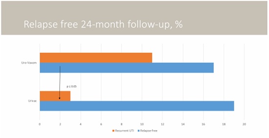 1-year follow-up has demonstrated the following results. In the first group receiving hexavalent vaccine (Urivac), relapse-free progression was observed in 86% of patients (18 children from 21) by the end of the study. In the group receiving bacterial monolysates Uro-Vaxom, relapse-free progression was observed in 65% (17 children from 26). Among those patients who did not receive urinary antiseptic at bedtime and bacterial lysates, relapse-free progression was observed in 10 from 31 children (32%). 1-step follow-up has shown slightly increased statistical validation.