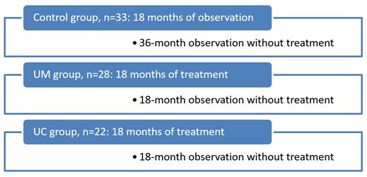 83 children were randomized into 3 groups: First-UC-consisted of 22 children, second-UM-consisted of 28 children and third-control group-consisted of 33 children (Figures 1 and 2). The male to female ratio was 1:6 in the UC group, 1:6 in UM group and 1:5 in control group.