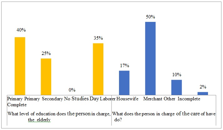 The results show that the majority of caregivers of the Elderly are married women who are in charge of household chores and are in an age range between 40 and 64 years, in their entirety they are Ecuadorians of indigenous ethnicity who have an incomplete level of primary education and without studies. It was also shown in this research that caregivers reflect a low level of knowledge because they have not received training in basic and instrumental activities of daily living such as food, hygiene, bathing, clothing, personal mobility, shopping, use of means of transport etc. , therefore, they indicate that they do not feel prepared to provide care that contributes to the improvement and maintenance of the health and independence of the elderly, since the care provided by caregivers is provided empirically as it was acquired in the community.