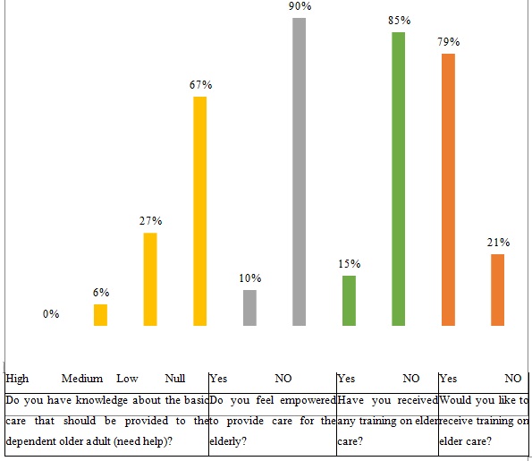 More than 90% of the population investigated mentions not having knowledge regarding the care that should be provided to the elderly, they do not have training, they also indicate that they have not received talks about the care of the elderly, it was observed that 79% of people show interest in being educated. Data that coincide when referring to the research called "Education to family members on the management of the dependent older adult carried out in Cuba 2014" in which when focusing on this theme of Family Education on the care of the elderly, the data show that more than 70% of the people investigated have inadequate knowledge about care [9]. The results of Pozo and Cassanova Moreno are related to this research because caregivers do not know and do not have adequate training on the practice of care that an older adult needs for their autonomy and therefore their improvement in the quality of life from this point to avoid complications in their health, the care they provide is acquired in an empirical way, care that only refers to food. The lack of knowledge is due to the lack of programs and activities in the community, since education has been focused on the formal aspect (primary, secondary, and higher), but not on the formation of skills and care capacities that are aimed at improving the life of the elderly.