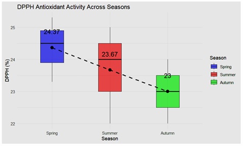 The statistical analysis of moisture content among the seasons indicated no significant difference (p>0.05) and revealed consistency of royal jelly at 64.00 per cent, 64.33 per cent 66.67 per cent in spring, summer and autumn, respectively. The results on Total Soluble Solids (TSS) present in royal jelly showed no significant variation as supported by a p-value of 0.739 (p>0.05) and it varied from 36.00 per cent, 35.67 per cent and 33.33 per cent in spring, summer and autumn, respectively. The high moisture content in autumn compared to spring and summer can be attributed wetter conditions, high temperature and high humidity (spring, autumn) that contribute to higher moisture retention, while drier conditions and low temperatures (summer) help retain higher moisture levels. Different flowering plants in each season produce nectar with varying water content, influencing the composition of royal jelly. Spring and autumn florals often have more moisture-rich nectar than summer florals. The present study is in line with studies by Garcia-Amoedo and Almeida-Muradian [46], conducted physicochemical analysis of fresh RJ were 67.58 per cent. Sereia et al. [43], reported an average range of moisture at 66.23- 67.81 per cent from royal jelly in A. mellifera. Nabas et al. [44], also reported moisture content to be 61.5±0.25 per cent. Kausar et al. [47], also reported that the total moisture content in fresh royal jelly at 60 per cent. In present studies, the results showed no significant variation in Total Soluble Solids (TSS) present in royal jelly across the seasons, as supported by a p-value of 0.739 (p>0.05). The TSS was relatively consistent with mean 35 per cent, recorded at 36.00 per cent, 35.67 per cent and 33.33 per cent in spring, summer and autumn, respectively. Tiwari [45], found the moisture content and solids content royal jelly at 64.35-68.57 per cent and 31.43-35.65 per cent. The mean moisture content obtained in royal jelly samples was 65.33 per cent, which is significantly higher than the average moisture content reported by Zhang et al. [30], for fresh RJ samples, which was 53.3 per cent. Sabatini et al. [9], reported that the moisture content in royal jelly typically ranges between 60 per cent and 70 per cent. The analysis showed significant variations in ash content across the seasons (p<0.05). The mean ash content in royal jelly samples were 2.00±0.00 in spring, 2.12±0.00 in summer and 2.01±0.00 in autumn, with an overall mean of 2.04. These results suggest that seasonal variations had a statistically significant impact on ash content, with the highest ash content recorded during the summer season. Nabas et al. [44], reported 1.10±0.05 per cent ash content in royal jelly. Kausar and More [47], also reported 1.22 per cent ash content in fresh royal jelly.