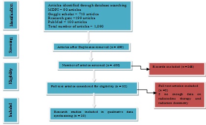 Search techniques: PRISMA, or Preferred Reporting Items for Systematic Reviews and Meta-Analyses, was followed for this study's systematic review. The MDPI, Research Gate, PubMed, and Google Scholar databases were used to search the English literature for recent studies on iodine therapy. The terms Differentiated Thyroid Cancer (DTC), Thyroid Cancer (thyroid carcinoma), Second Primary Malignancy (SPM), Radioiodine Therapy (RIT), Radioactive Iodine Therapy (RAI), and RAI therapy were used in this search. Other search terms included: side effects of radioiodine-131 therapy on patients, iodine-131 therapy for thyroid-related diseases, Radiometric Analysis of Patients with Diseases Associated with the Thyroid, administered Iodine-131 activity, Iodine uptake in the remaining thyroid in the postoperative bed, Maximum Tolerable Activity administered to the patient, Iodine's effective half-life after administration to the patient, measurement of the dose rate to the general public and caregivers, estimation of the total radiation dose, and dos rate release criteria of patients treated with iodine-131.