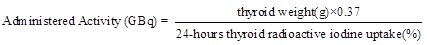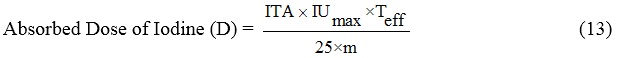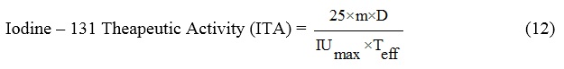 where Teff is the effective 131I half-life in remnant thyroid and A is the therapeutic activity of iodine-131 of 3700 MBq, 25 is the unit conversion coefficient, and m is the mass of the remnant thyroid measured using an ultrasound scanner (days).