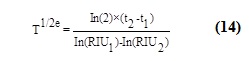 Where T1/2e is the effective half-life during the radioiodine test [days] and RIU is the radioiodine uptake in percent at time point t=t1 or t2, respectively.