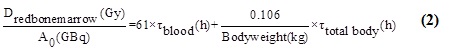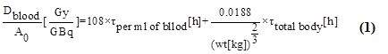 Radiometric analysis of patients with thyroid related diseases [Dosimetry in iodine-131 therapy]: Benua & Leeper and the blood absorption method were used to determine the Maximum Activity of Iodine-131 that could be given to the patient without going over the Bone Marrow Tolerance Limit of 2 Gy. The Medical and Internal Radiation Dosimetry (MIRD) scheme is used in the blood dosimetry method to determine the radiation dose to the blood per Giga-Becquerel of radioactivity utilizing full body scans and blood samples. The following equations calculate the blood dose that was absorbed. Dblood stands for average blood dose, Ao for amount of activity administered, τ for time-integrated activity coefficients derived from areas under the decay curve, and wt for patient weight.