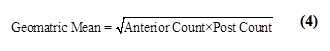 Geometric mean: On the anterior image, a Region of Interest (ROI) rectangle was formed around the entire body. The number of total pixels and counts/pixel in the anterior and posterior photographs were obtained. Equation 3 was used to get the geometric mean of the counts per pixel for the complete body scan (cpp).