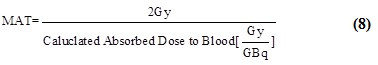 Maximum tolerable activity administered to patient: By calculating the maximum activity that could provide the radiation absorbed dosage of 2 Gy to blood, the maximum activity to be administered to the patient can be computed as shown in equation (8).
