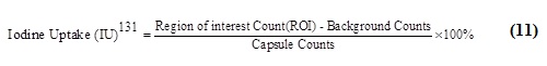 IU131 is the amount of iodine absorbed by the leftover thyroid in the postoperative bed after n hours (n = 6, 24, 48, or 72 h), and ROI Counts is the total number of counts in the area of interest (ROI) throughout the measurement (i.e. 5 min). The ROI in the patient's postoperative bed was an iodine-rich residual thyroid. A 131I-capsule (3700 MBq) inserted in a neck phantom was counted over a five-minute measurement period. Backdrop counts are the number of counts that are marked in the postoperative bed as the background for evaluation. Murielle's formula can be used in addition to the previously mentioned technique to determine the therapeutic activity of 131I. (3700 MBq).