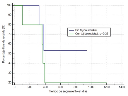 Figure 4: Kaplan Meier event freedom analysis in patients with and without postsurgical residual tissue.