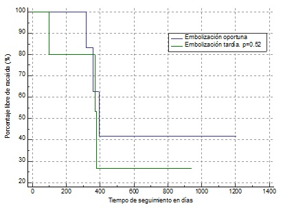 Kaplan Meier event freedom analysis was performed for residual tissue (Figure 4) in which, although there were no significant statistical differences, the patients who were left with residual tissue tended to present greater recurrence and this occurred within the first 100 days of follow-up (approximately two and a half months). In the Kaplan Meier freedom analysis for preoperative embolization (Figure 5), no significant differences were found; however, patients who underwent late embolization (>72 hr) tended to present greater recurrence and this occurred early, within the first 100 days of follow-up.