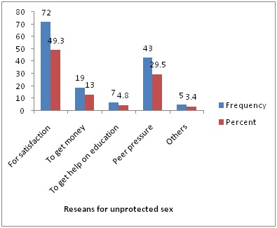 In this study 15 (8%) of the study participants who had ever practiced sexual intercourse had practiced sex with commercial sex workers and this is comparatively higher than the study finding from Benishangul that revealed 5.5% [15]. The major reasons reported for practicing unprotected sexual intercourse encounter in those who ever practiced sexual intercourse 72 (49.3%) of them to get satisfaction and 43 (29.5%) of the respondents was due to peer pressure. Similarly, studies conducted in Benshangul and Boditi showed that sexual desire and peer pressure were among the motivators with risky sexual behaviors [13,15].