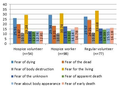 Given these considerations, the following question was posed: Are there differences in the type of experienced thanatic anxiety in the hospice Team in the groups studied: hospice volunteer, hospice worker, regular volunteer? It has been assumed that each group may (but need not) display a different type of thanatic fear.( thanatological fear: of dying, of the dead, fear of the destruction of the body, fear of the unknown, fear of the appearance of the body, of the living, of apparent death, fear of premature death)