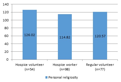 Because the distributions of the analyzed variable in the compared groups did not conform to a normal distribution (all the results of the Shapiro-Wilk test exceeded the threshold of statistical significance), the nonparametric Kruskal-Wallis test was performed to compare the means obtained in the three groups. A statistically significant result was obtained, which was H(2) = 13.312; p < 0.01. It means that at least one mean is different from the others. A detailed post hoc analysis using Dunn's nonparametric test with correction for unequal groups and Bonferroni's correction for the level of significance established the nature of the differences detected. It turns out that hospice volunteers (M = 126.02, SD = 31.31) score significantly higher (p < 0.001) on the personal religiosity scale than hospice workers (M = 114.82, SD = 28.12). In contrast, regular volunteers (M = 120.57, SD = 27.44) do not differ significantly in their level of personal religiosity relative to either group. To sum up, according to the interpretative assumptions of the "Personal Religiosity Scale".[9], the higher the score, the greater the propensity of the respondent to personal religious experiences (personal contact with God). Thus, on the basis of the group averages it can be concluded that hospice volunteers, hospice workers as well as regular volunteers are characterized by religiosity of a personal nature. This speaks for the tendency (inclination) of the respondents to experience personal contact with God. Religiousness, turning to God has an intracontrolled character, external conditions do not determine the relation to God, do not change the relationship with God. The smallest details of life are manifestations of the existence of God and experiencing Him. Based on the results obtained, it can be concluded that the hypothesis H2: There are different types of religiosity in the hospice team - it has not been confirmed. The entire study population shows the same type of religiosity.
