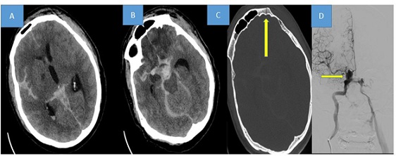 Figure 1: Brain CT scan revealing extensive subarachnoid hemorrhage (SAH) with greater prominence on the right side. (A and B). Bone view window displaying multiple bone fractures (one of them indicated by the yellow arrow) (C). Digital Subtraction Angiography (DSA) illustrating a traumatic carotid cavernous fistula on the right side (D).