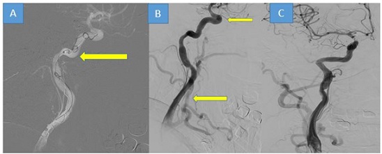 Figure 2: Image “A’’ showed the spontaneously disconnected coil in the right internal carotid artery. (Yellow arrow) The detached portion of the coil was straightened and elongated using a stent proximally and distally (yellow arrows, (B). A final run DSA revealed a fixed coil firmly pressed against the carotid wall by the stent, and complete closure of the carotid-cavernous fistula (C).