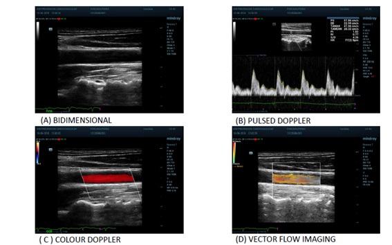 The high-frame rate VFI is based on PWI. Acquisition of flow vector information at high frame rates was obtained by performing multi-directional transmissions of plane waves; after a single plane wave transmission, multiple images receiving lines were obtained. It allowed calculation of the true velocity vectors at any location in a vessel. The dynamic flow was obtained by continuously updating the target’s position according to the calculated velocity. The interleaved transmission sensure both a highly sensitive vector flow image and a high-resolution B-mode images. The flow was analysed by the system for 1.5 s at a Pulse Repetition Frequency (PRF) of 10-15 kHz and at a very high frame rate of 400-600 Hz, depending on the used PRF, allowing to study atleast one cardiac cycle. The data were reprocessed automatically by the US system in a 35-36-s clip, generating a sequence of about 600-900images that could be displayed at aframe rate of 20-30Hz.The acquired data could be further evaluated in the saved video. Such a high frame rate allowed a detailed analysis of haemodynamics.