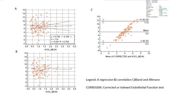 Finally, we evaluated if there was a relation between the regional and the systemic parameters, namely carotid PWV with c- PWV and the Wall Shear Stress (WSS) with the peripheral endothelial function test (Figures 7 and 8).