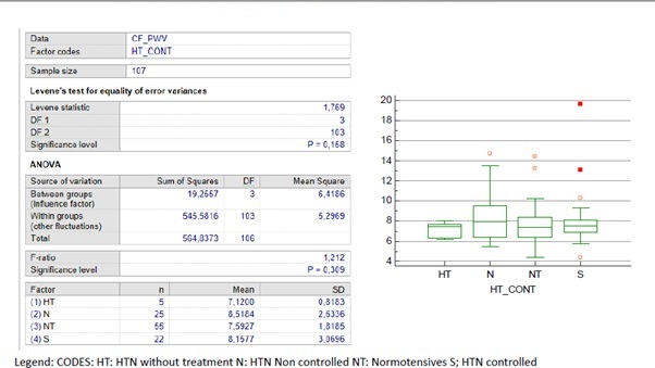 We analysed two well-known parameters measured in peripheral arteries widely renown and supported by solid scientific evidence; Carotid femoral Pulse Wave Velocity and Post ischemic dilatation of the brachial artery as index of endothelial function. Carotid femoral PWV was measured as described in guidelines and Endothelial function according guidelines and the results corrected according to age and brachial artery diameter. We found as expected significative differences between hypertensives and normotensives with higher c-f PWV and lower endothelial function in the first group (Figure 6) [13]. The Atherosclerotic plaques burden is also included in this group, as includes carotid and femoral plaques. The burden increased with age but showed no differences according to sex or the presence of hypertension.