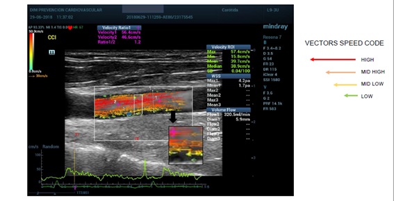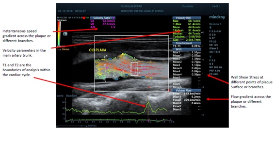 Introduction: Atherosclerosis is the underlying cause of a cardiovascular disease epidemic worldwide. The understanding of normal artery structure and function and the initial disarrangements conducting to atherosclerosis is of key relevance to develop preventive interventions based on a rational study of arterial structural and functional parameters, their pathologic behaviour and response to therapeutic interventions. New US approaches enable a precise evaluation of the forces and stimuli acting on the arterial wall and measure its responses precisely in different clinical stages of the arterial atherosclerotic disease and a better assessment of the efficacy or not of different therapeutic interventions. The ability to analyse WSS hemodynamically and to measure it accurately is an essential basis for the assessment of the atherosclerotic risk in the general population. A new angle-independent technique, measuring and visualizing blood flow velocities in all directions, called Vector Flow Imaging (VFI), has been proposed. Systems are equipped with VFI based on a multi-angle transmission plane waves method, which allows a very high frame rate and a detailed visualization of complex flow.