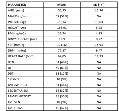 This study enrolled 110 consecutive patients derived to perform a non-invasive vascular evaluation to refine the assessment of their cardiovascular risk. The mean age was 55.9 + 13 y.o., fifty-seven were men (52%) and there were no significative differences of age between sexes (men 55 + 12.5 and women 57 + 12). Eleven of them were on secondary prevention (7 men, 4 women, 8 Coronary Artery Disease revascularized and 3 chronic stroke), 8 had no CV risk factors, 35 did not receive CV medications (antihypertensives and hypolipemiants). Fifty-one(46%) were hypertensives, 46 of them (90,2%) under treatment with classic antihypertensives (beta blockers, RAS inhibitors, calcium antagonists and diuretics) with different degrees of blood pressure control (22 controlled, 28 not controlled and 5 without treatment at the moment of the evaluation).The distribution of the remaining risk factors is described in table 1.