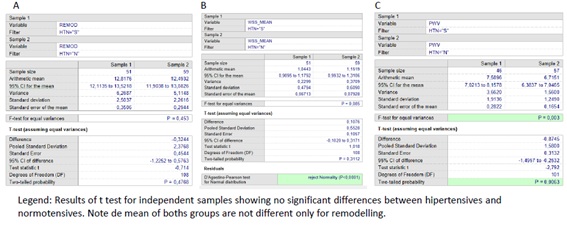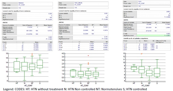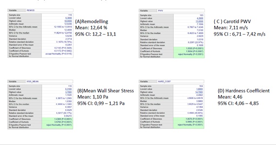 We tried to define the reference boundaries for these parameters, and then if there were differences between hypertensives and normotensives (Figure 4). The comparison between hypertensives and normotensives did not show significative differences for remodelling but showed significative differences for carotid PWV and mean WSS (Figure 5).