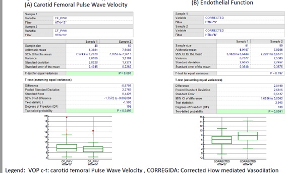 Figure 6: Comparison of regional parameters (A) carotid - femoral pulse wave velocity (c-f PWV) and (B) Endothelial Function according to the presence or not of hypertension.