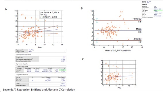 Figure 7: Comparison of regional c-f pulse wave velocity and Carotid PWV.
