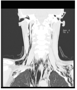 Figure 2: Cervical and thoracic CT-Scan (coronal, non-contrast) demonstrating extensive emphysema extending through the neck, from the cranial base to the supraclavicular fossa, on the right and the shoulders, on the left.
