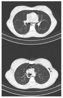 Figure 3: Chest CT-Scan (axial, non-contrast) showing extensive pneumomediastinum and bilateral small blades of pneumothorax. No tracheal perforation. Heart and aorta within normal limits.