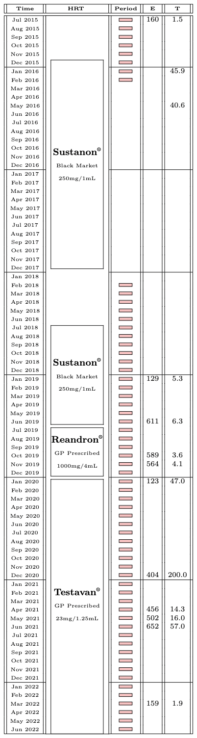 Compiled is a table with all previous blood test results regarding hormone levels, in chronological comparison with HRT used and whether periods were occurring at the time (Table 1).