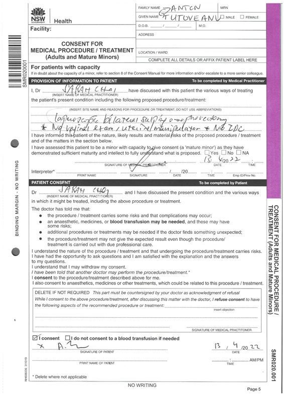 Risks Modern day pelvic surgical operations carry low risk of complications [28]. For this patient’s age, health, condition and the surgeon’s experience, the risks involved in performing such procedure were basically zero. Two studies cited earlier each report back on a large number of pelvic operations that were successfully performed without a uterine manipulator. A. Kavallaris, et. al. reported on 67 total laparoscopic hysterectomies between 2008-2009 without any uterine manipulation having zero complications [12]. While D. Zygouris, et. al. reported on 1023 cases between 2011-2020 of the exact same procedure having zero conversions of laparoscopy to laparotomy [13]. After two appointments with the surgeon, the patient felt confident in the procedure and went ahead with scheduling an operation date on Friday 17th June 2022. The consent form was concisely filled out as attached in the appendices.