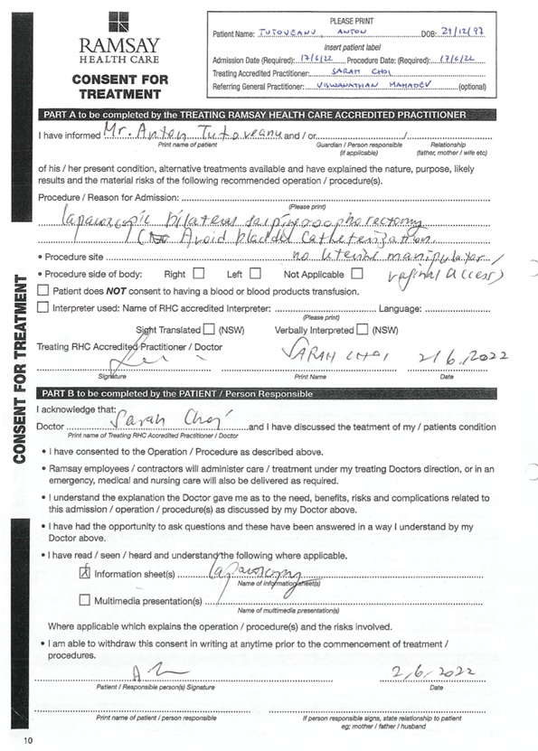A pre-operative appointment on Thursday 2nd June 2022 finalised and confirmed all details of the surgical procedure. Starting Tuesday 14th June 2022, the patient began clearing his bowels by fasting 3 days prior along with taking PicoPrep® laxative solution the night before operation.