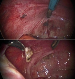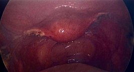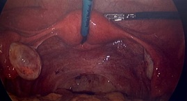 8:00am Systematic inspection of pelvis conducted. Uterus, ovaries and fallopian tubes appeared normal. Appendix, liver and sub-diaphragmatic surfaces also normal. Uterus was propped up by the assistant with forceps through the suprapubic port (Figure 6).