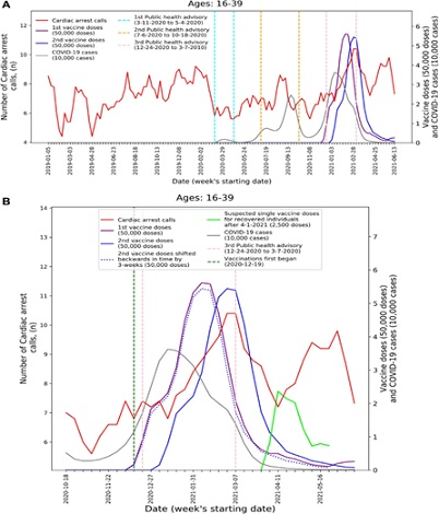 Figure 11: Weekly counts of cardiac arrest calls (5-week centered moving-average), COVID-19 cases (3-week centered moving-average), and vaccination doses (3-week centered moving-average) for those between 16 and 39 during: A) the study period (Jan 1 2019- Jun 20, 2021) and B) the third COVID-19 wave and vaccination distribution period (Oct 18, 2020- Jun 20, 2021). COVID-19 disease 2019. From 28 April 2022 Increased emergency CV events among under-40 population in Israel during vaccine rollout and third COVID-19 wave Christopher L. F. Sun, E. Jaffe, Retsef Levi Scientific Reports vol. 12.