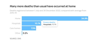 From https://news.sky.com/story/excess-deaths-reach-highest-level-since-pandemic-peak-how-much-are-nhs-failings-to-blame-12780446. Extra deaths in 2022 close to highest level in 70 years - how much are NHS failings to blame? “More deaths at home Many of the recent excess deaths are occurring at home, as opposed to in hospitals or care homes.