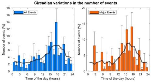 Figure 13: Distribution of events during the day. Bars: average hourly incidence of events computed across different years. Whiskers: standard error. Solid line: moving average. From https://doi.org/10.3390/ijerph20042872 Circadian and Seasonal Pattern of Arrhythmic Events in Arrhythmogenic Cardiomyopathy CM Patients by Silvia Castelletti et al.