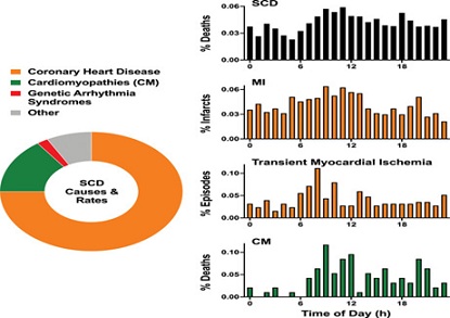 Figure 14: Several types of CV disease exhibit a time of day incidence in sudden cardiac death (SCD) or events. The left graphic shows the causes and rates for SCD by several different types of CV disease (data from Hayashi et al . Shown on the right is the 24-h incidence of SCD, myocardial infarction , transient myocardial ischemia episodes, or SCD in people with hypertrophic cardiomyopathy (CM; data from Muller et al, Wolters Kluwer Health, Inc and Maron et al). from Understanding Circadian Mechanisms of SCD : A Report From the National Heart, Lung, and Blood Institute Workshop, Part 2: Population and Clinical Considerations.