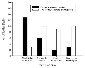 Over half the deaths related to atherosclerosis (13 of 24) on the day of the earthquake occurred between midnight and 6 a.m., whereas only 3 of 32 (9 %) of the deaths during the 7 days before the earthquake occurred at that time of day (P = 0.002). The earthquake that struck the Los Angeles area at 4:31 a.m. on Jan 17, 1994, was 1 of the strongest earthquakes ever recorded in a major city in North America. From N Engl J Med 1996; DOI: 10.1056/NEJM199602153340701According https://fortune.com/2022/10/06/strokes-heart-attacks-sudden-death-america-long-term-risks-catching-covid-carolyn-barber/