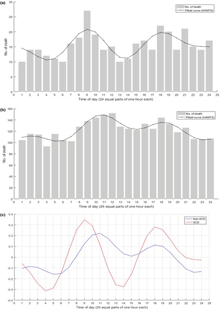 Figure 17: (a) Circadian variation in the frequency of sudden cardiac death (SCD). The fitted curve is shown in black (p < 0.01, n = 371). (b) Circadian variation in the frequency of non-SCD. The fitted curve is shown in black (p < 0.01, n = 2929). (c) Circadian variation based on fitted curve among SCD and non-S.C.D. The circadian curve was calculated by (fitted curve value − average fitted curve value)/averae fitted curve value.From EMPIRICAL RESEARCH QUANTITATIVECircadian aspects of mortality in hospitalized patients: A retrospective observation from a large cohort Miao Fang, Shunju Xiang, Xiaoqiang Xiao, Qianning Mo, Yang Si08 March 2023 https://doi.org/10.1002/nop2.1711.