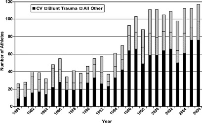 Figure 19: Number of cardiovascular (CV), trauma-related, and other sudden death events in 1866 young competitive athletes, tabulated by year. From https://doi.org/10.1161/CIRCULATIONAHA.108.804617.