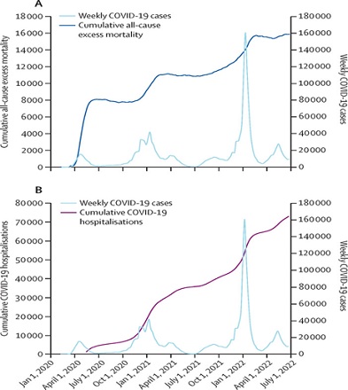 Figure 2: All-cause excess mortality, COVID-19-associated hospitalisations, and confirmed COVID-19 cases in Massachusetts, USA (A) Shows the cumulative all-cause excess mortality (blue line) plotted against weekly confirmed new COVID-19 cases (light blue line) in Massachusetts, from Feb, 2020, through Jun 2022.7 (B) Shows the cumulative number of COVID-19-associated hospitalisations ( the purple line) plotted against weekly confirmed new COVID-19 cases (light blue line) in Massachusetts, from Feb, 2020, through June, 2022;7 hospitalisation data did not become available until May, 2020. From doi: 10.1016/S1473-3099(22)00547-3 Lancet Infect Dis. 2022 Oct.