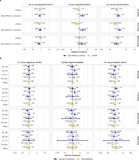 Figure 20: Relative incidence of cardiac and all-cause death in the risk period after vaccination, compared to the baseline period, by sex, age group and vaccine vector. From doi.org/10.1038/s41467-023-36494-0.