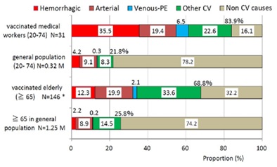 Of the reported vaccinated elderly death cases, 69% died from CV causes, while 26% died in the general population. MOR is 5.9 (p<0.0001). MOR of hemorrhagic stroke (12.8) and VT/PE (24.9) were also very high.
