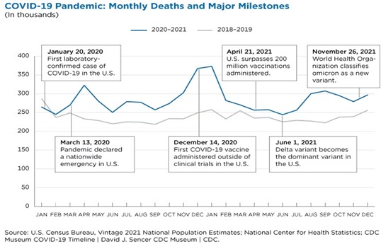 Figure 22: From Pandemic Disrupted Historical Mortality Patterns, Caused Largest Jump in Deaths in 100 Years March 24, 2022 Written by: Shannon Sabo and S. Johnson https://www.census.gov/library/stories/2022/03/united-states-deaths-spiked-as-covid-19-continued.html.