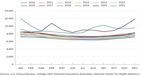 Figure 23: Average daily deaths by month in the united states: 2010-2021.