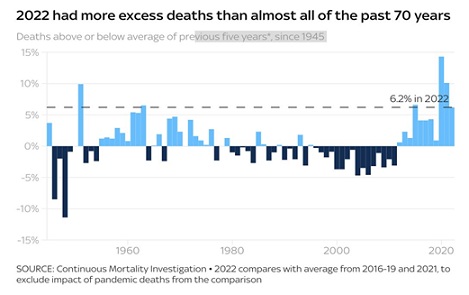 According Covid-19: Pandemic disruption linked to 30 000 excess heart disease HD deaths, charity reports BMJ Nov 2022. “Between March 2020 and the Aug 2022 there were more than 30 000 excess deaths involving coronary heart disease HD, an average of 230 a week above the expected death rate. Many people have not been able to access care for conditions like as high blood pressure, that could raise the risk of a future heart attack HA or stroke, the foundation’s report said.” And in website https://www.bbc.com/news/health-64209221 Excess deaths in 2022 among worst in 50 years. “More than 650,000 deaths were registered in the UK in 2022 - 9% more than 2019 (Figures 3 & 4)”.