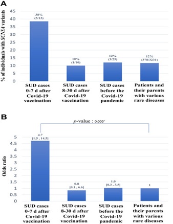 Figure 5: A: Frequencies of SCN5A variants in our cohort with SUD cases within 7 days of COVID-19 vaccination, in Thai SUD cases during 8–30 days after COVID-19 vaccination during the same period, in a Thai cohort of SUD before the COVID-19 pandemic, and in our in-house exome database enrolling patients and their parents with various rare diseases. B: The odds ratios OR and 95% confidence intervals for SCN5A variants and SUD in study groups, compared with the in-house exome controls as a reference. The asterisk indicates that the P-value reaches statistical significance of less than .05. From doi.org/10.1016/j.hrthm.2022.07.019.