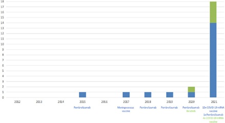 Figure 6: NumB. of cases of suspected drug- or vaccine-induced MYOCARDITIS MC, periMYOCARDITIS MC and pericarditis reported to the Regional Pharmacovigilance Centre from 2012 until July 2021.Blue bars and blue lettering indicate the number of MYOCARDITIS MC and periMYOCARDITIS MC cases, green bars and green lettering indicated the number of pericarditis cases. The RPVC in Basel is 1 of 6 RPVCs in Switzerland (population 8.5 million), and covers northwestern region. from Glob Cardiol Sci Pract. 2021 Oct 30. doi: 10.21542/gcsp.2021.18 MYOCARDITIS MC and pericarditis in association with COVID-19 mR.N.A.-vaccination: cases from a regional pharmacovigilance centre RPC.
