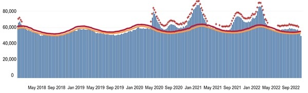 Figure 8: Weekly mortality in the U.S. reported by the CDC as of Oct 2022. The red line marks the upper bound of the threshold for expected deaths, above which more deaths than expected have been registered. Weeks of excess mortality are indicated by a red cross.