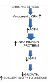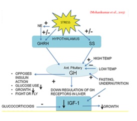 In livestock, growth hormone levels increase in stress, but IGF-1 levels decrease in response to stress. This might be due to an increase in GHRH levels through NE levels. Simultaneous activation of the HPA axis facilitates the increase in GHRH. Fasting increase growth hormone and decrease IGF-1 levels in livestock due to down regulation of growth receptors in liver [23]. Acute stressors decrease glucose utilization so that blood glucose levels increase and prepare the animal to ?ght or flight. Chronic stress decreases insulin-like growth factor (IGF)-1 production and inhibit growth. The reduction in IGF-1 levels result in reduced growth, and the conservation of energy and nutrients for survival. This is believed to be an important adaptive response, shifting energy resources from growth to survival [24]. Pathway and effect of stress on growth hormone axis is shown in (Figure 9).